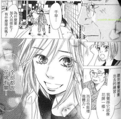 千早加入田徑社,千早的許多選擇,都與花牌相關。一切的一切都是爲了花牌。對她來説,除了花牌,她沒有其它能做的事。