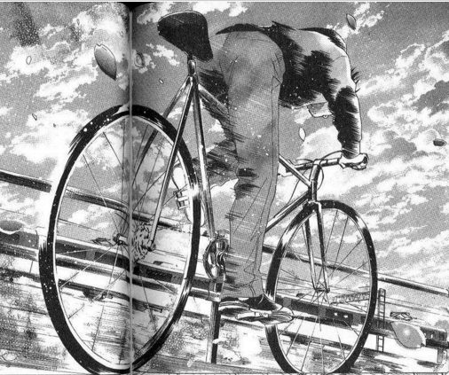 千早手刀衝刺,從後面把新連人帶車地扯住滾下坡。(好孩子不要學)